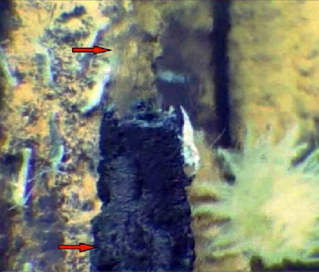 Рис. 6. Сульфидная труба и прозрачный бесцветный дым (показаны стрелками). Стоп-кадры видеосъёмки на рудном поле Ашадзе-1 в ходе российско-французской экспедиции Serpentine, 2007