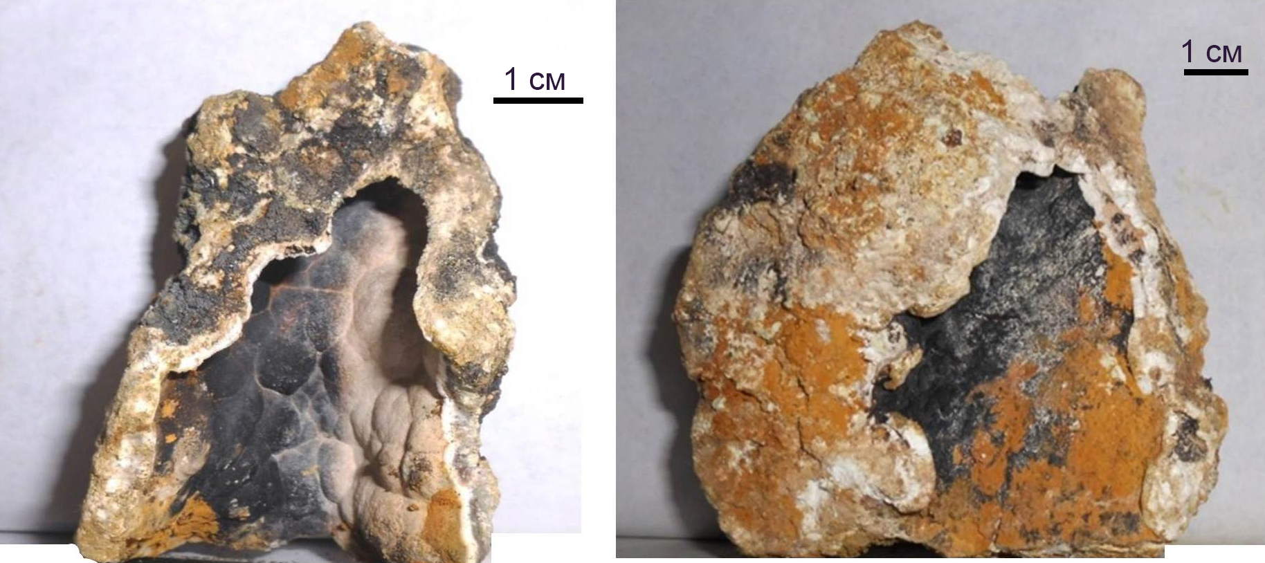 Fig. 7. White smoker structures in the form of pipes with a hollow channel. The front wall of both structures is broken off, the walls of the internal channels are covered with a coating of vernadite (black) with an admixture of goethite (brown). Vernadite (a) and Goethite (b) in the form of a coating, also develop on the outer wall of the structure