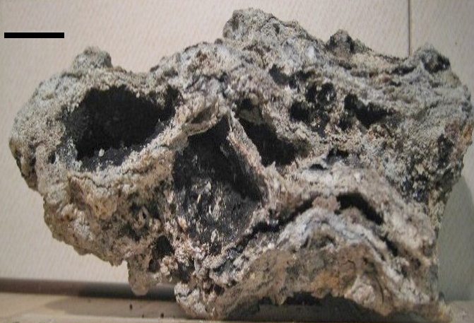 Рис. 7. Постройки белых курильщиков в виде труб с полым каналом. Передняя стенка обеих построек обломана, стенки внутренних каналов покрыты налётом вернадита (чёрное) с примесью гётита (бурое). По наружной стенке построек в виде налёта развиваются вернадит (а), гётит (b)