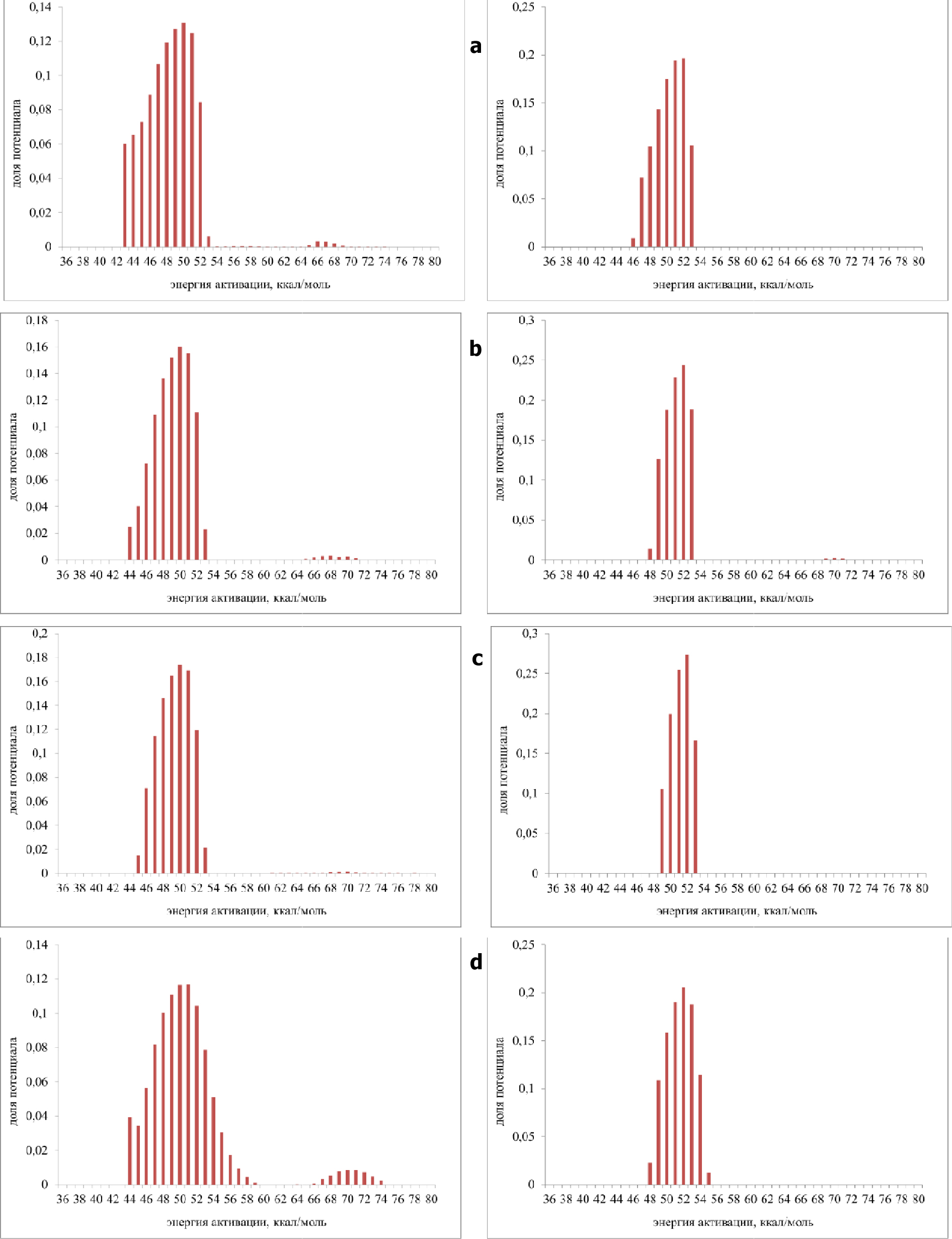 Рис. 3. Распределение начального потенциала образования н-бутана (левая колонка) и н-пентана (правая колонка) по шкале энергий активации при сухом ступенчатом пиролизе керогена до и после гидротермального воздействия: