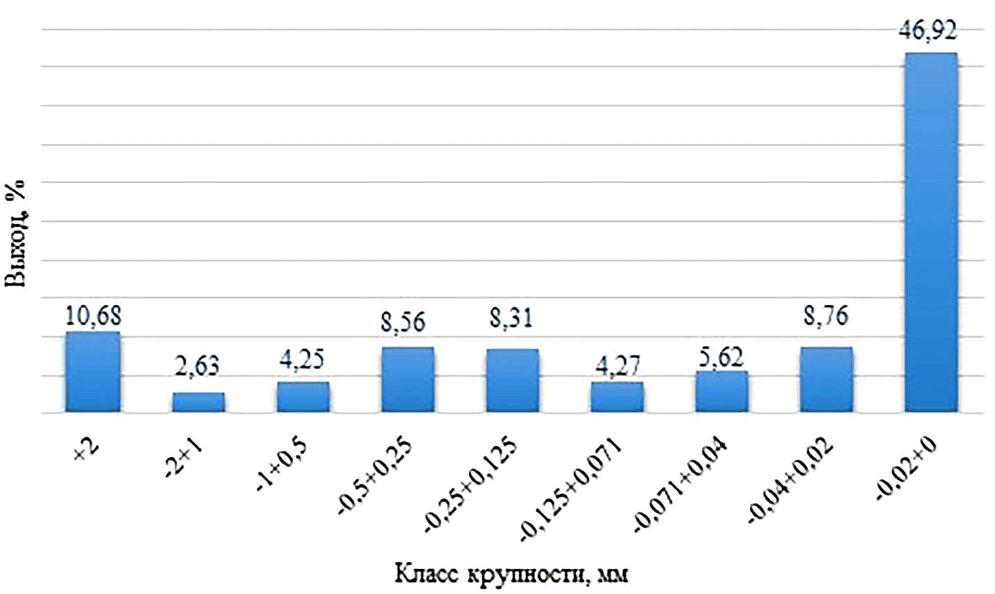 Гранулометрическим анализом установлено, что 51.96 % от исходного сырья имеет крупность менее 20 мкм с показателем зольности сухого топлива (Ad) 25.4 % (рис. 1). Выход материала более 2 мм составляет 10.01 % с показателем Ad 35 %. Показатель Ad в классе крупности от 0.02 до 0.04 мм составляет 20.5 % с выходом 9.13 %. В классе крупности от 1 до 2 мм показатель Ad равен 22.3 %. Показатель Ad в материале от 0.071 до 1 мм варьирует от 18.8 до 8 %.