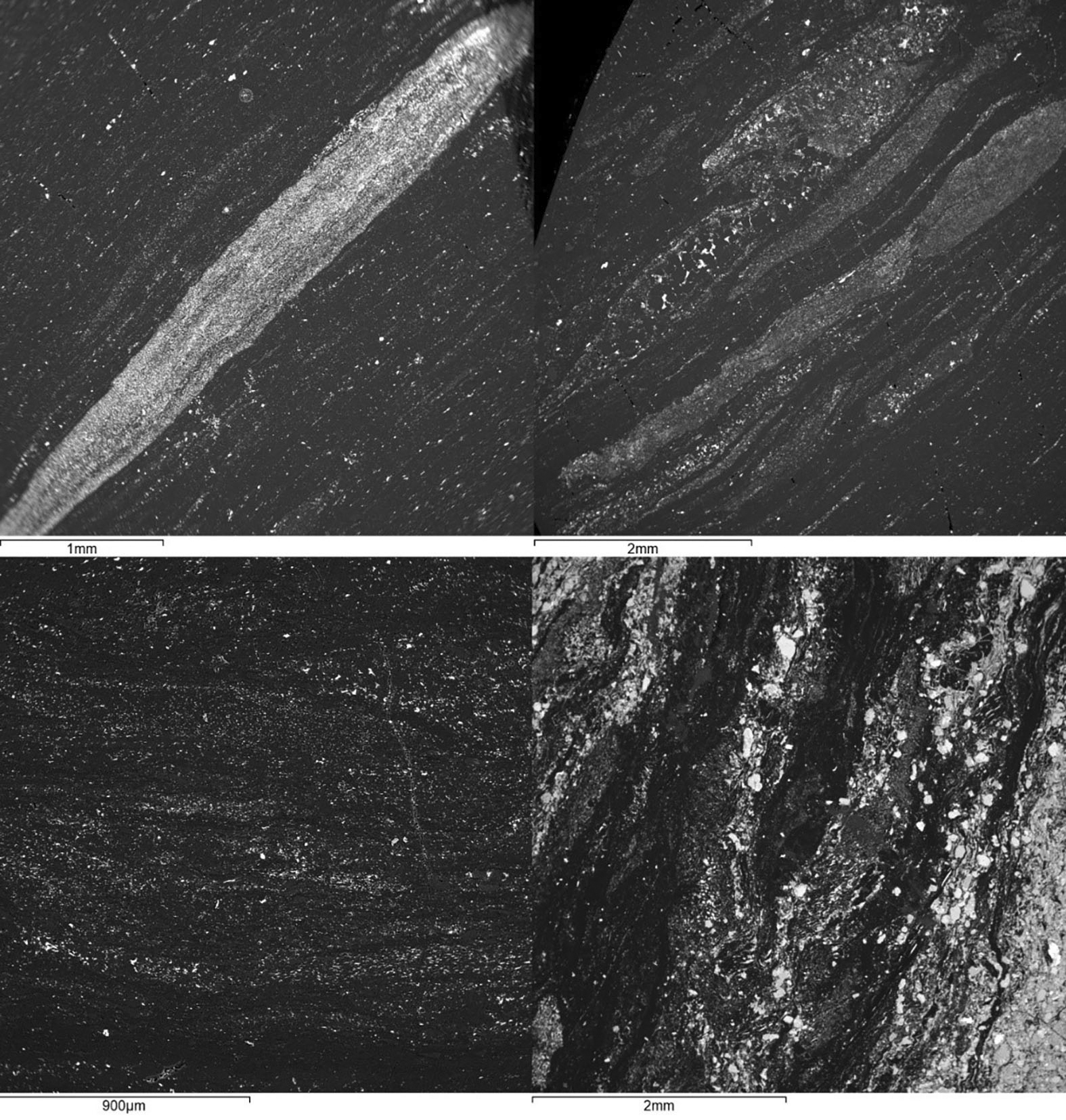 При исследовании аншлифов с помощью сканирующего электронного микроскопа установлено, что изучаемые образцы представляют собой полифазные агрегаты, состоящие из минералов и угля. Среди минеральных составляющих в таких агрегатах отмечаются кварц, каолинит, сидерит, апатит, пирит и рутил. На изображениях общего вида образцов в обратнорассеянных электронах (рис. 5) чётко прослеживается переслаивание чистого или слабозагрязнённого угля с его полифазными агрегатами.