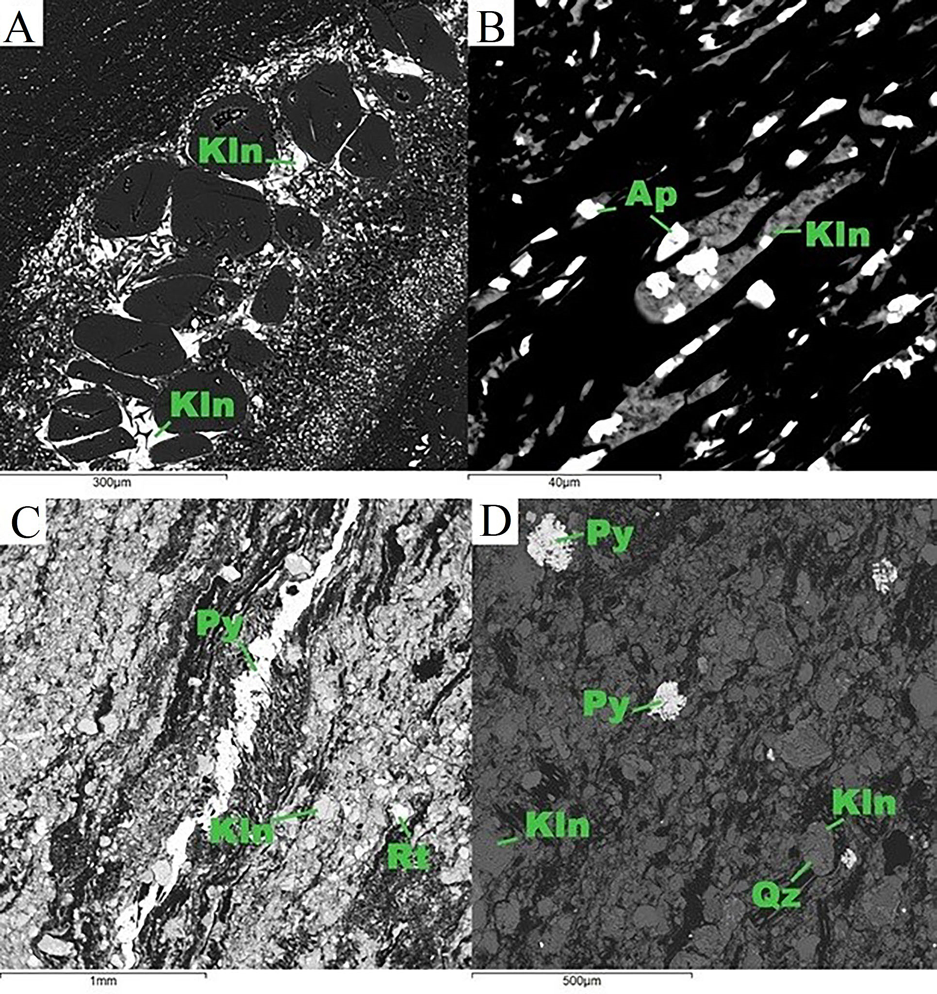 Рис. 6. Микрофотографии фрагментов аншлиф-брикета: a — каолинит, заполняющий клеточные полости, b—d — микропереслаивание угля и полифазных минеральных агрегатов. Kln — каолинит; Py — пирит; Rt — рутил. Ap — апатит, Qz — кварц. Изображения в обратнорассеянных электронах