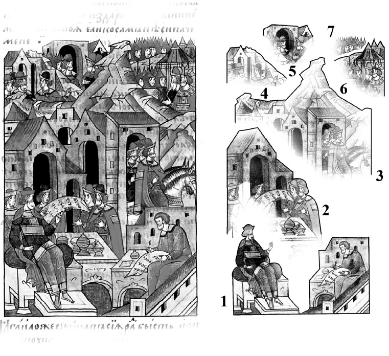 Русский поэт и философ Алексей Степанович Хомяков [18, с. 7], основоположник раннего славянофильства, впервые предложил термин «соборность» как принадлежность истины всей Церкви в целом, а не одному лицу или учреждению, сколь авторитетны они ни были, как свободное разделение радости бытия или страданий всем братством людей. Это можно сравнить с хором, где каждый человек поет в унисон с другими, привносит свою тональность, данную ему Богом, а солист только объединяет и усиливает общее песнопение. В Лицевом летописном своде можно наблюдать такую же идею, но выраженную в визуальных образах. Человек «в одиночку» встречается здесь очень редко. Можно предположить, что в средневековой системе ценностей отдельный человек как бы и не существовал. Он всегда был выразителем, представителем целого коллектива. В этом мы видим одну из важнейших характеристик русской культуры, исходящую из менталитета русского народа, что значительно отличает его от западноевропейского индивидуализма и «культа личности», неповторимой индивидуальности. Но если вдруг в миниатюре мы видим одного персонажа, что крайне редко встречается в Своде, то его обязательно сопровождает изображение Бога в мандорле или просто благословляющая десница, то есть человек не один и не оставлен Всевышним. В Лицевом летописном своде просто нет изображений одинокого человека, оставленного всеми. В русской культуре нет образа Гамлета. Однако для Западного мира, это, пожалуй, самая символичная фигура, центральная фигура: одинокий, покинутый всеми, терзаемый сомнениями, лишенный поддержки людей и небесных сил человек. Может в этом кроется секрет некой популярности Гамлета в России, что он, по сути, совершенно чужд нам, русским людям, а, с другой стороны, притягателен как запретный плод. Рассмотрим на примере одной из миниатюр Лицевого летописного свода осуществление принципа соборности как художественный прием (см. композиционную ситуацию в рис. 2).
