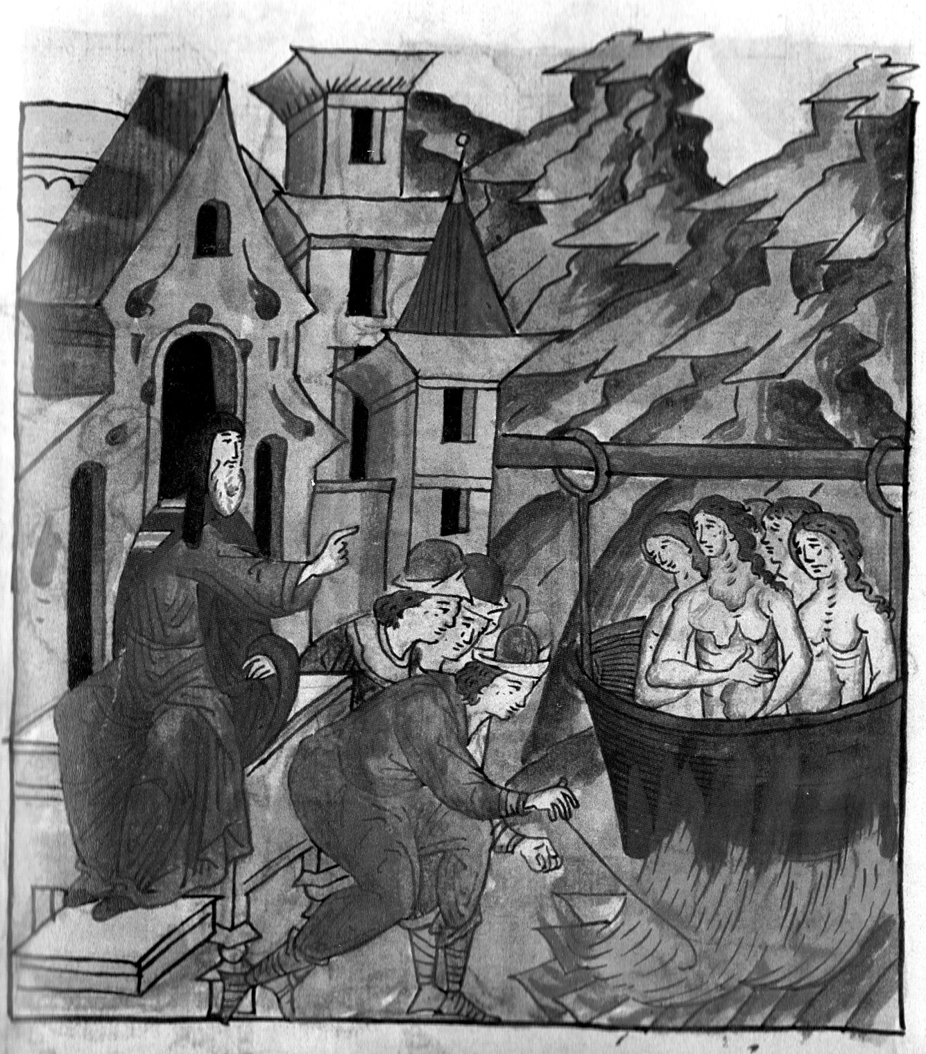 Православный художник, безусловно, знает о существовании зла, однако не считает его главным в мире; мы видим некое отстраненное отношение ко всему происходящему. Он воспринимает зло как естественное проявление несовершенства мира, созданного Богом, но населенного грешными людьми. Православному художнику свойственно самоумаление и вообще умаление человеческих заслуг. Напротив, в европейском искусстве (особенно начиная с эпохи Ренессанса) идёт процесс всяческого возвеличивания человека как венца творения – человек правит миром, природой, все в его руках. Западные художники в своих произведениях пытаются всеми возможными способами привлечь внимание к своей картине и для этого пользуются самыми разными средствами: подавить, испугать, соблазнить зрителя, вызвать у него шок. Здесь усматривается прямая «эмоциональная манипуляция»: художник как бы диктует зрителю, что тот должен чувствовать и понимать, тем самым лишая его свободы, превращая в духовного раба. В православном искусстве нет ничего подобного. Древнерусский художник как бы «гармонизирует» своего зрителя с помощью создаваемых им образов. Он заключает страдания и ужас мира в своеобразную «скорлупу» любви и благодати, предоставляя возможность самостоятельной оценки, создает для человека, зрителя эффект предстояния перед образом. Сравнивая русское и европейское искусство XIII–XVII вв., можно заметить удивительную особенность. Произведения, созданные православными мастерами, оставляют жизнеутверждающее ощущение света, радости. От большинства же европейских картин, напротив, исходит какое-то подавляющее, тёмное, зловещее чувство. Как же удавалось русским художникам увидеть и передать зрителю эту радость жизни? Ведь совершенно очевидно, что они прекрасно знали тёмные стороны жизни. Многие сцены в Лицевом своде буквально «залиты кровью», наполнены страданиями, ужасами, смертью – начиная с крестных страстей Иисуса. Есть в рукописи и картины ада, и кровопролитные сражения, отрубание голов, кипячение в котле и разные другие ужасы, связанные со смертью (рис. 3). Однако даже эти кровавые сцены не вызывают у зрителей ужаса и отвращения – чувств, которые часто испытывает тот, кто созерцает произведения Иеронима Босха, Альбера Альтдорфера, Маттиаса Грюневальда, Ханса Гольбейна и многих других известных художников Западной Европы.