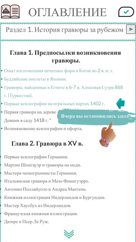 Стрелки-переходы к следующему разделу (главе, параграфу) будут понятны всем, так как подобные обозначения встречаются в любом приложении.