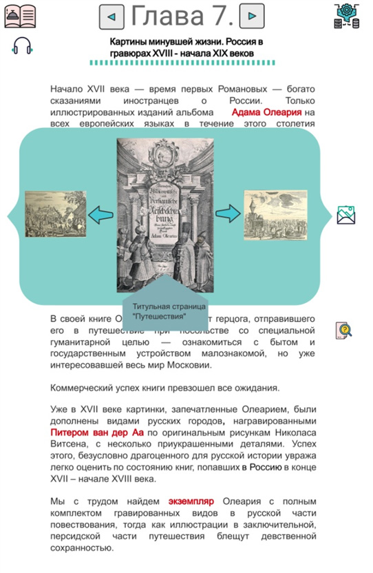 Другие элементы аппарата издания, характерные для научно-популярных трудов, представлены в виде мультимедийных элементов. Так, к примеру, вместо примечаний помещаются гиперссылки, а вместо комментариев – подкасты искусствоведов. Подчеркнем, что наличие аудиовидеосопровождения является важной составляющей мультимедийного издания. Кроме записей лекций могут быть использованы интервью с приглашенными экспертами: реставраторами, художниками, сотрудниками музеев, кураторами выставок, экспертами аукционных домов. Значимую помощь в усвоении визуальной информации может оказать саундтрек, воспроизводящий музыкальные произведения соответствующей страны и эпохи (например, французский импрессионизм в гравюре / М. Равель, К. Дебюсси; русская гравюра конца XVIII в. / Д.С. Бортнянский).
