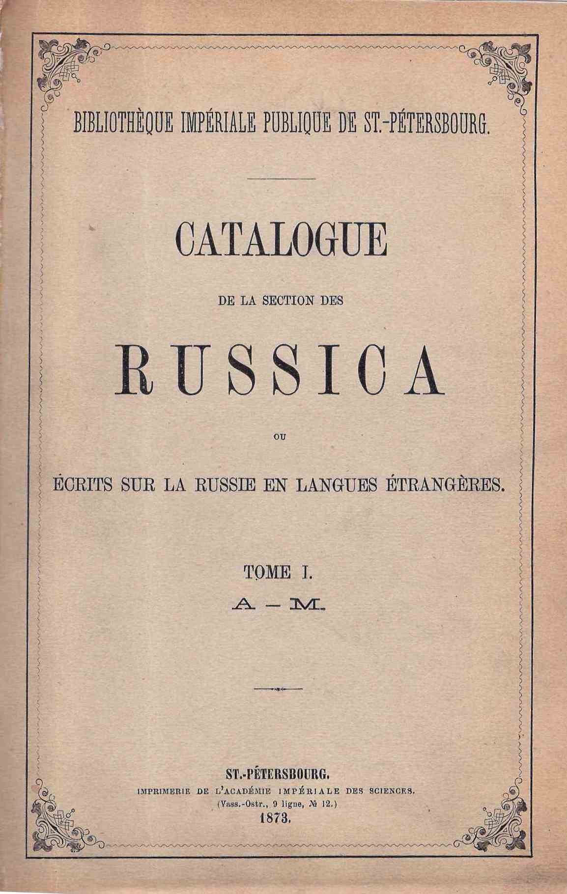 13 Catalogue de la section des Russica ou écrits sur la Russie en langues étrangères. Saint-Pétersbourg: Imprimerie de l'Académie Impériale des Sciences, 1873. Т. 1–2.