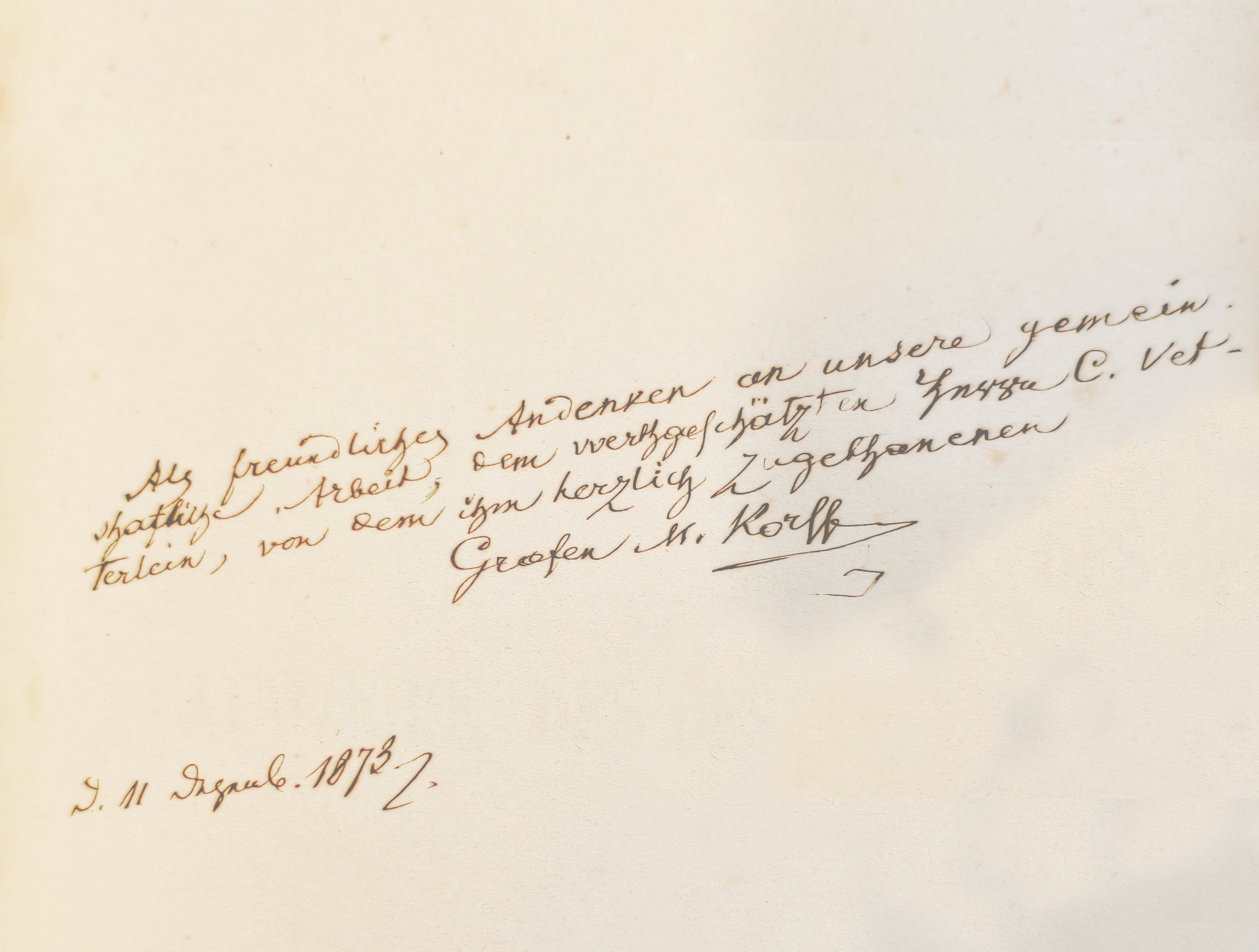 «Aus freundliches Andenken an unsere gemeinschaftliche Arbeit, dem werthgeschätzten Herrn C. Vetterlein, von dem ihm herzlich Zugehanenen Grafen M. Korf