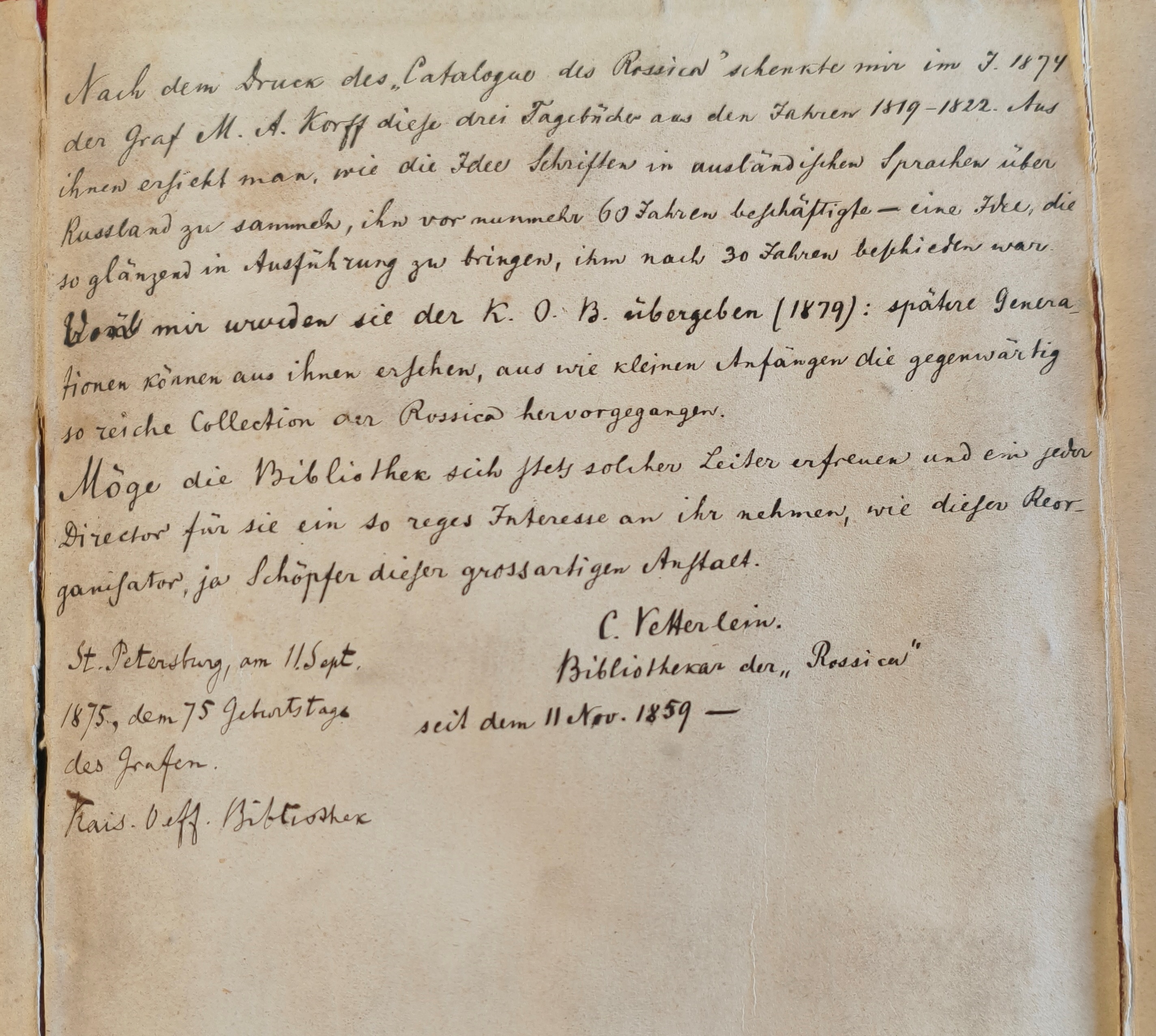 «Nach dem Druck des “Catalogue des Rossica” schenkte mir im J. 1874 der Graf M. A. Korf diese drei Tagebücher aus den Jahren 1819–1822. Aus ihnen ersieht man, wie die Idee Schriften in ausländischen Sprachen über Russland zu sammeln, ich vor nunmehr 60 Jahren beschäftigte – eine Idee, die so glänzend Ausführung zu bringen. ihm nach 30 Jahren beschieden war.