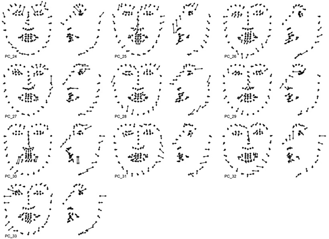 Другой вариант – проведение анализа главных компонент на основе ранее полученного набора координат ключевых точек, при котором часть компонент «зафиксирована» и отражает характерные мимические паттерны, связанные с набором AU, предположительно присутствующих в анализируемой мимике.