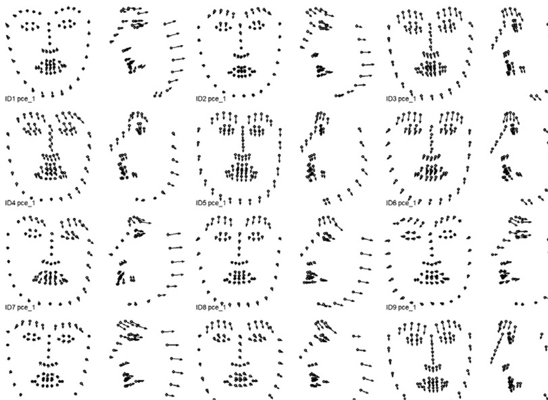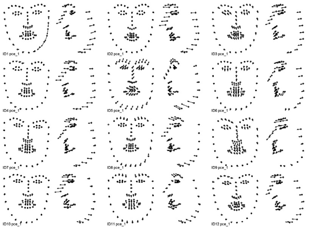 Поиск индивидуальных комплексных динамических паттернов, связанных с выражением соответствующей эмоциональной экспрессии, выполняется с помощью анализа главных компонент раздельно для каждой из 12 видеозаписей, обработанных OpenFace. Входными показателями анализа главных компонент являются соответствующие наборы данных 3D координат 68 ключевых точек. По результатам анализа для каждой эмпирической главной компоненты вычисляются: