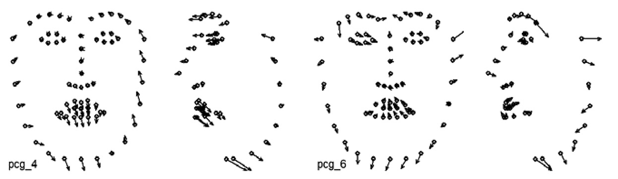 Возможное решение описанной проблемы состоит в определении функционала каждой из AU как комплексного изменения координат всех ключевых точек. В таком случае теоретически возможна смена «базиса», т.е. Point Distribution Model будет опираться не на формально полученные и трудно содержательно интерпретируемые NRSP (см. Рис. 1, 2, 3), а на физиологически обоснованные AU, соответствующие сокращению отдельных мышц лица. В таком случае модель детекции ключевых точек получила бы содержательное физиологическое основание, при этом вклад каждой AU мог бы быть вычислен непосредственно в ходе подгонки модели. При этом получил бы естественное обоснование вопрос о полноте системы используемых AU.