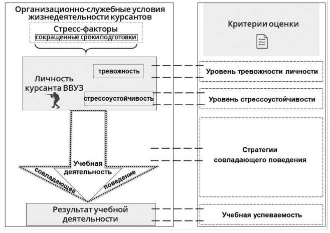 Таким образом, курсант осуществляет учебную деятельность в условиях стресс-факторов организационно-служебной жизнедеятельности, исходя из того, какими уровнями личностной тревожности и стрессоустойчивостью он обладает, при этом выбор наиболее конструктивного способа совладающего поведения может обеспечивать учебную успеваемость обучающегося, позволяя приспособиться к специфическим условиям военного вуза.