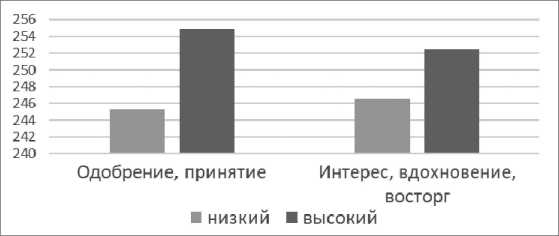 По уровню отзеркаливания эмоций различаются статистически значимо эмоции по всем ситуациям вместе, по группам: одобрение, принятие (p=0,037); настороженность, недоумение, шок (p=0,001); безразличие, история не затронула (p=0,000); уныние, печаль, горе на уровне тенденции (p=0,054) (рис. 10). Люди, имеющие низкий уровень отзеркаливания эмоций в целом, чаще оценивают ситуации кибербуллинга через эмоции: одобрение, принятие и безразличие, история не затронула, чем люди с высоким уровнем отзеркаливания эмоций. Люди, имеющие высокий уровень отзеркаливания эмоций в целом, чаще оценивают ситуации кибербуллинга через эмоции: уныние, печаль, горе на уровне тенденции и настороженность, недоумение, шок, чем люди с низким уровнем отзеркаливания эмоций.