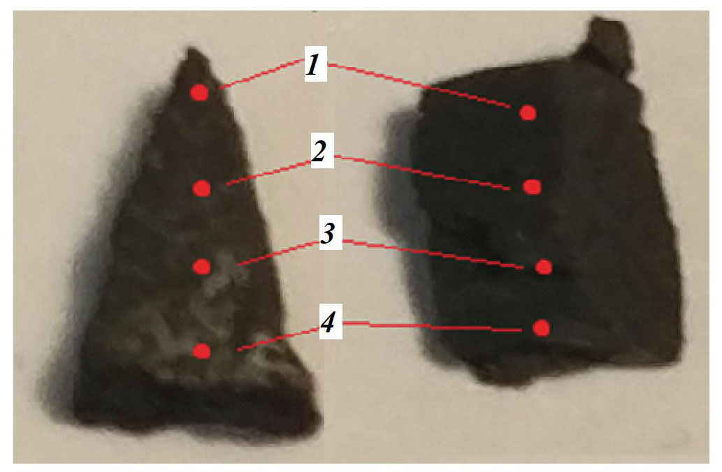 For microscopic inspection and registration of Raman spectra for each of the materials several observation points were selected. An example of the choice of points for recording the RMS for different samples of fine-grained dense graphite MFG-6 is presented in Fig. 1.