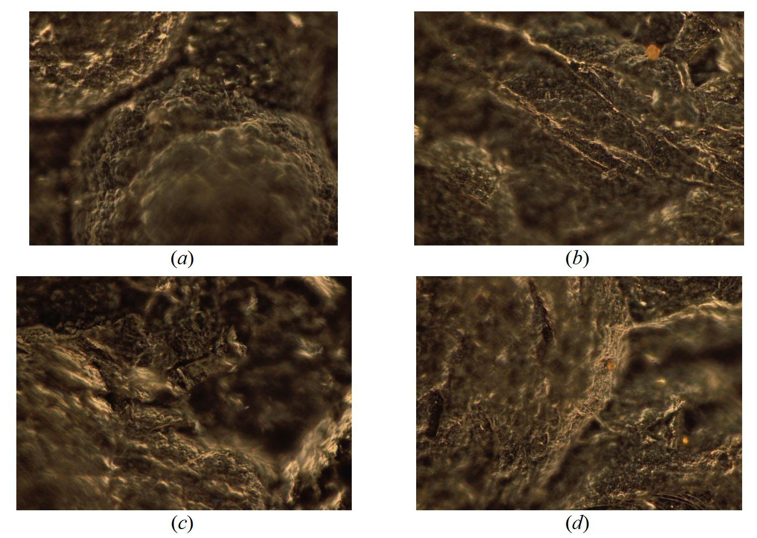 Fig. 3. Surface view at 50× magnification of different sections of pyrolytic graphite samples before use as a field emission cathoede (a) and after use as a field emission cathode (b, c, d). Surface image size 280 × 225 µm