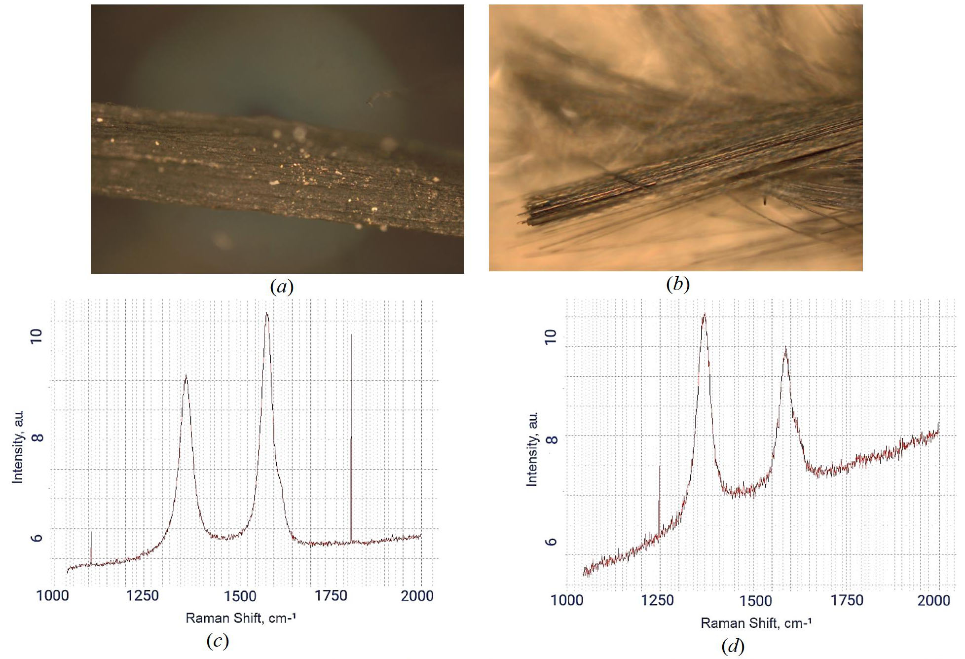 Fig. 8. Optical microscopy (a and b) (10× magnification) of carbon nanotube cathode and Raman spectra (c and d) for carbon nanotubes (CNT filaments) before (a and c), after (b and d) their use as a field emission cathode material (The size of the surface section is 1.4 × 1.1 mm)