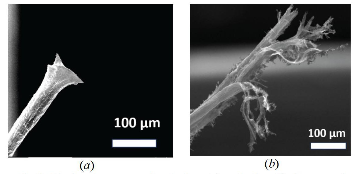 Fig. 10. SEM images of individual carbon nanotubes before (a) and after (b) the operation of these nanotubes as part of the field emission cathode
