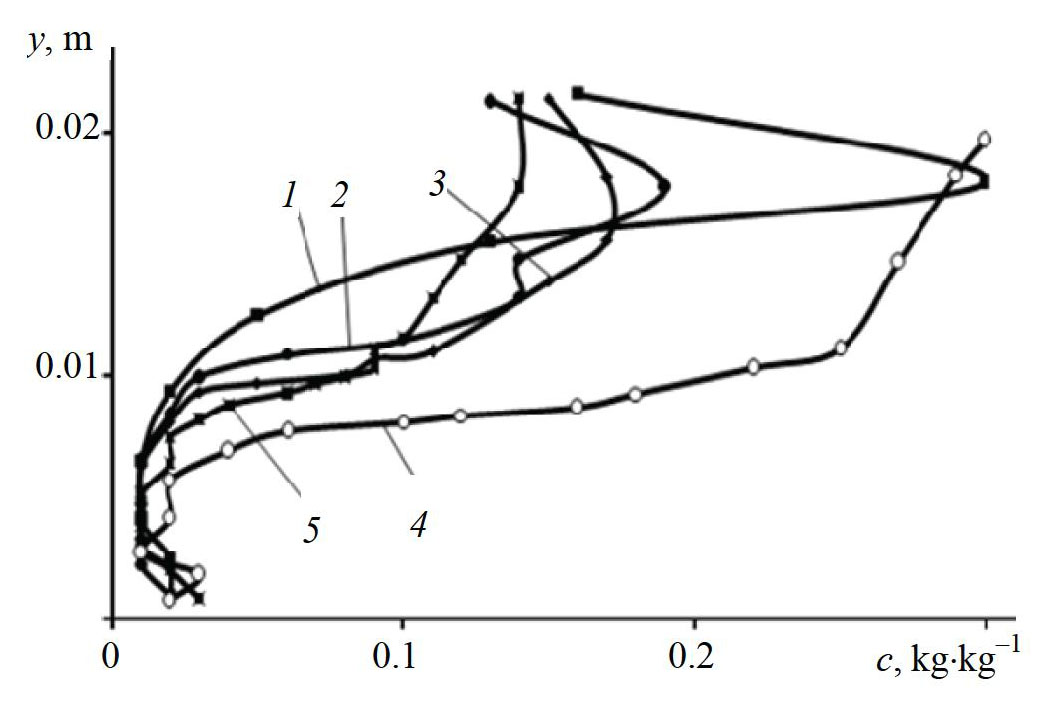 In the profiles (Fig. 8) for flows with momentum action, a zone of high concentration gradient of test particles is clearly visible, the dislocation of which in the flow volume completely coincides with the location of zones of intense shear deformation (Fig. 6) and a high gradient of the volume fraction of voids (Fig. 7). With an increase in the intensity of the momentum effect, the zone of extreme values of velocity gradients, volume fraction of voids and concentration of the test component deepens without reducing the magnitude of the gradients (curves 2–4 in Figs. 6–8). However, as the zone approaches the base of the bed at a distance equal to approximately two particle diameters and a further increase in the intensity of the momentum action, signs of impending destruction of the zone are observed (curves 5 in Figs. 6-8). First of all, the destruction of the zone is evidenced by a sharp decrease in the velocity gradients, the volume fraction of voids and the concentration of the test component and a shift in the extreme values of the gradients towards the upper boundary of the flow.