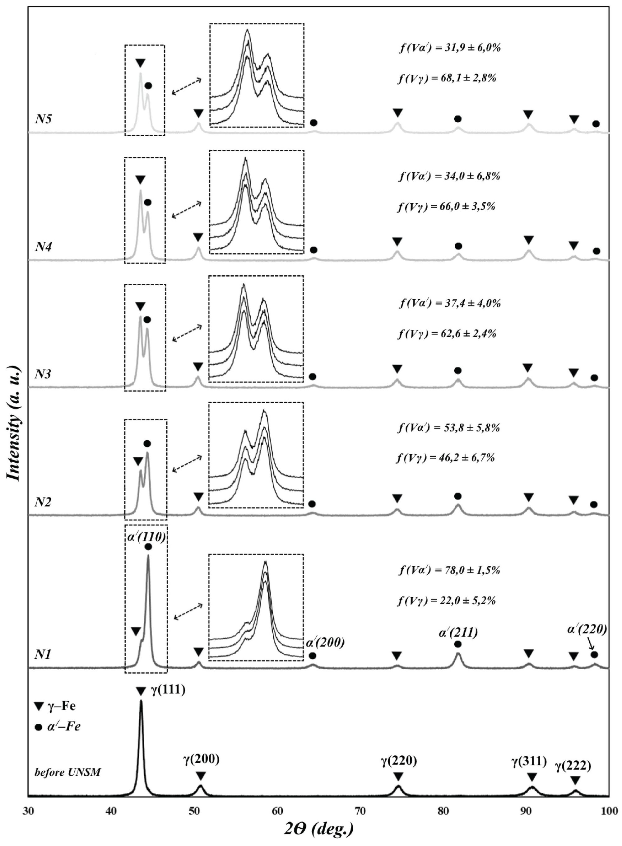 Figure 1 demonstrates the diffractograms of AISI 321 stainless steel samples before and after UNSM with different processing densities. As Figure 1 shows, the diffractogram of the untreated sample corresponds to the FCC lattice of iron: the maxima in the region of diffraction angles 43.6°, 50.7°, 74.5°, 90.6° and 95.9° are formed by the lattice planes of the g-phase of iron (austenite). The composition of the near-surface layer of all UNSM-treated samples is biphasic and, in addition to austenite, is represented by deformation-induced martensite with a BCC lattice, which is confirmed by the presence of reflexes in the diffractograms in the region of angles 44.5°, 64.5°, 81.8° and 98.4° corresponding to the lattice planes of a¢-phase iron (martensite) [26, 27].