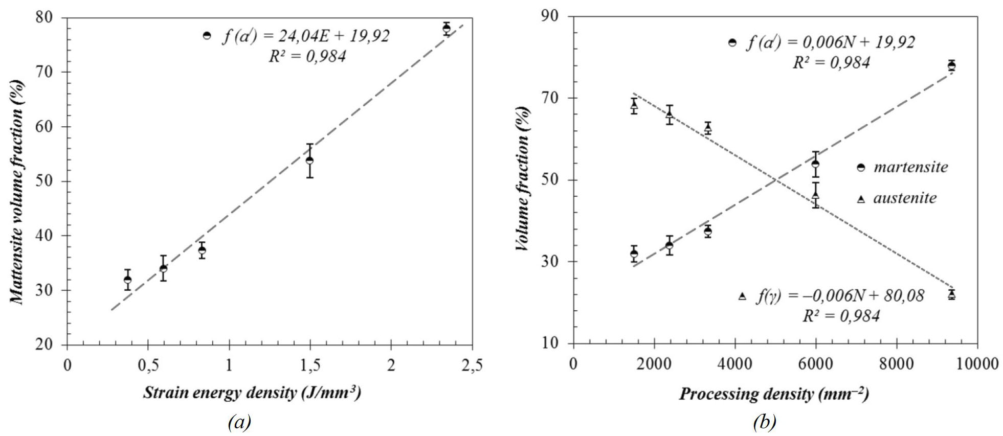 Fig. 2. Dependencies of austenite and martensite volume fractions in AISI 321 steel near–surface layer from (a) strain energy density and (b) processing density induced by UNSM