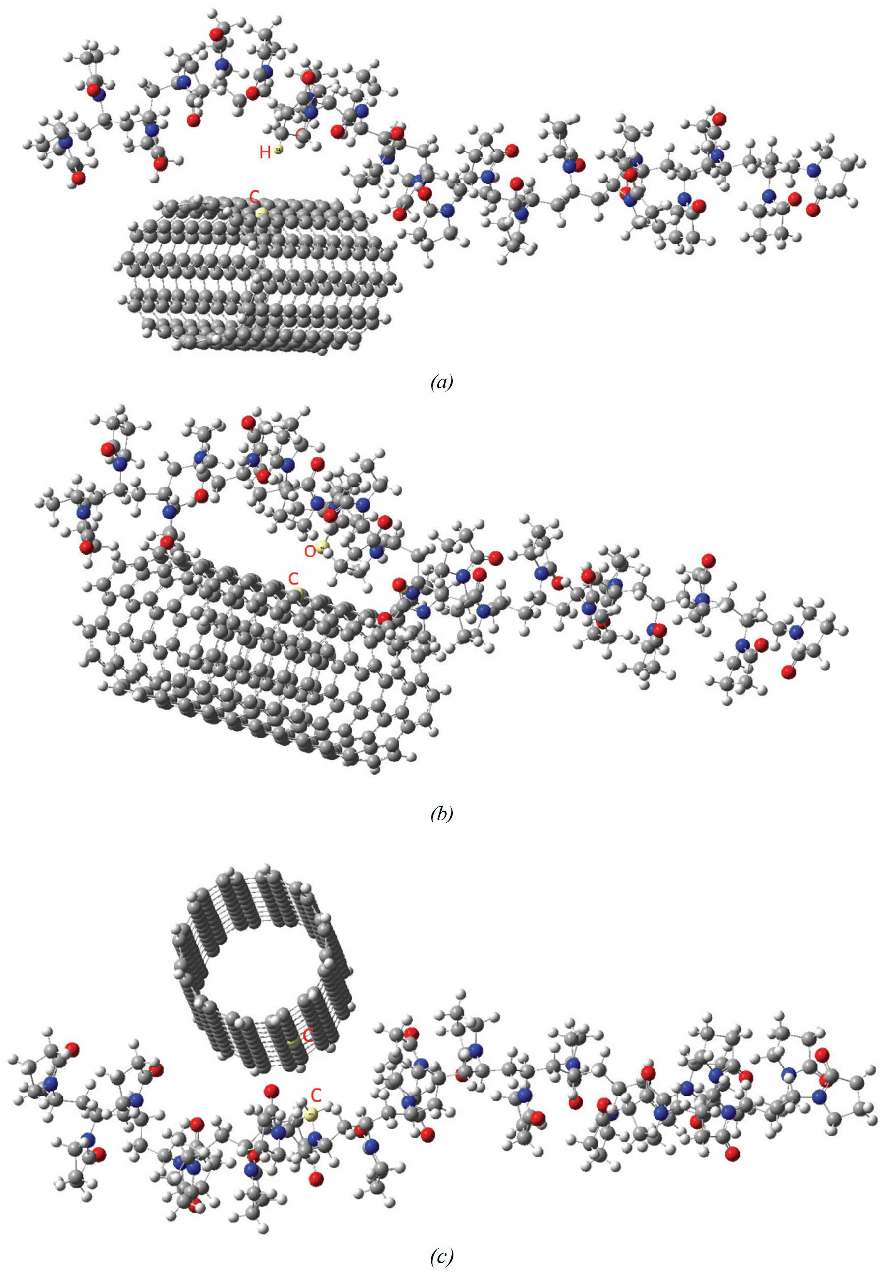 Fig. 1. Model of surface modification of (6, 6) carbon nanotube with polyvinylpyrrolidone when oriented: a – by a hydrogen atom (H) to a carbon atom (C) of the nanotube surface; b – by an oxygen atom (O) to a carbon atom (C) of the nanotube surface; c – by a carbon atom (C) to a carbon atom (C) of the nanotube surface