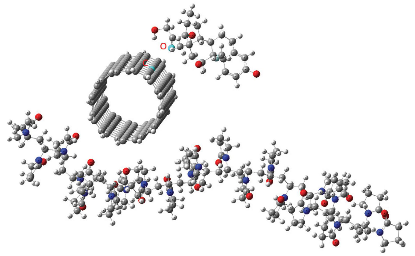 The dexamethasone (or tegafur) molecule was brought closer with a step of 0.1 Ǻ to a stable complex consisting of a carbon nanotube cluster and a polyvinylpyrrolidone fragment including 21 monomer units orienting the oxygen atom of the molecule to the carbon atom of the CNT surface with its perpendicular arrangement relative to the longitudinal axis of the nanotube (Figs. 3, 4).