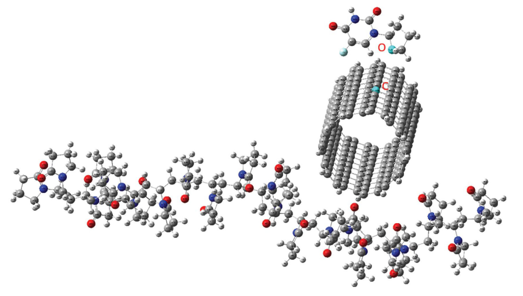 Fig. 4. Model of interaction of the tegafur molecule with the “polyvinylpyrrolidone + carbon nanotube” complex