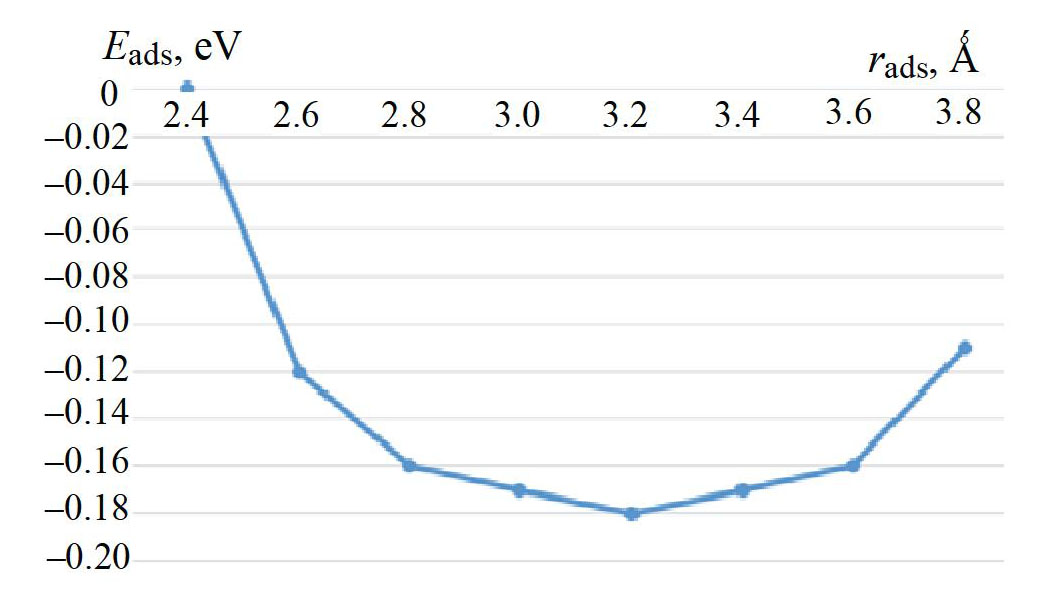When analyzing the energy dependence, a minimum of the potential interaction energy (E = –0.18 eV) was found at a distance of 3.2 Å, which indicates the formation of a stable complex during physical interaction.
