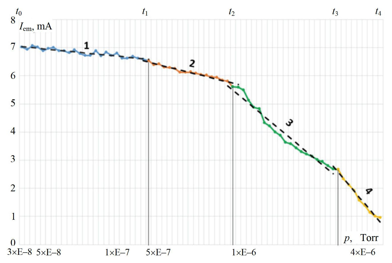 It is known theoretically that the cathode temperature can be affected by several factors simultaneously: the heating model and the temperature coefficient of heater resistance. To solve the problem of excessive desorption during heating, they resort to optimizing temperature conditions [22] and monitoring the current cathode temperature during thermionic emission [23] or using a synergistic effect with new approaches to stimulating desorption and diffusion processes [24–26]. The paper [26] shows that the cathode temperature decreases as the current collected by the anode increases. When the emission current was 180 mA, which corresponded to a current density of 2.92 A×cm–2 the cathode temperature decreased by 29 °С in the constant voltage heating mode and by 35 °С in the constant current heating mode.