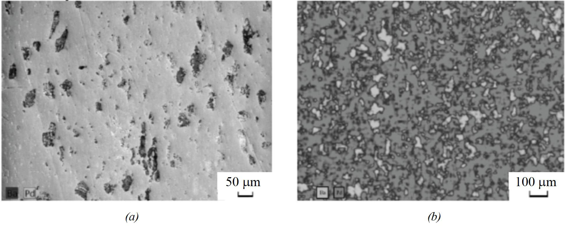 Fig. 2. Samples of palladium-barium emitters with fractional compositions of the initial powder a) 20–45 mm, b) 45–63 mm [76]