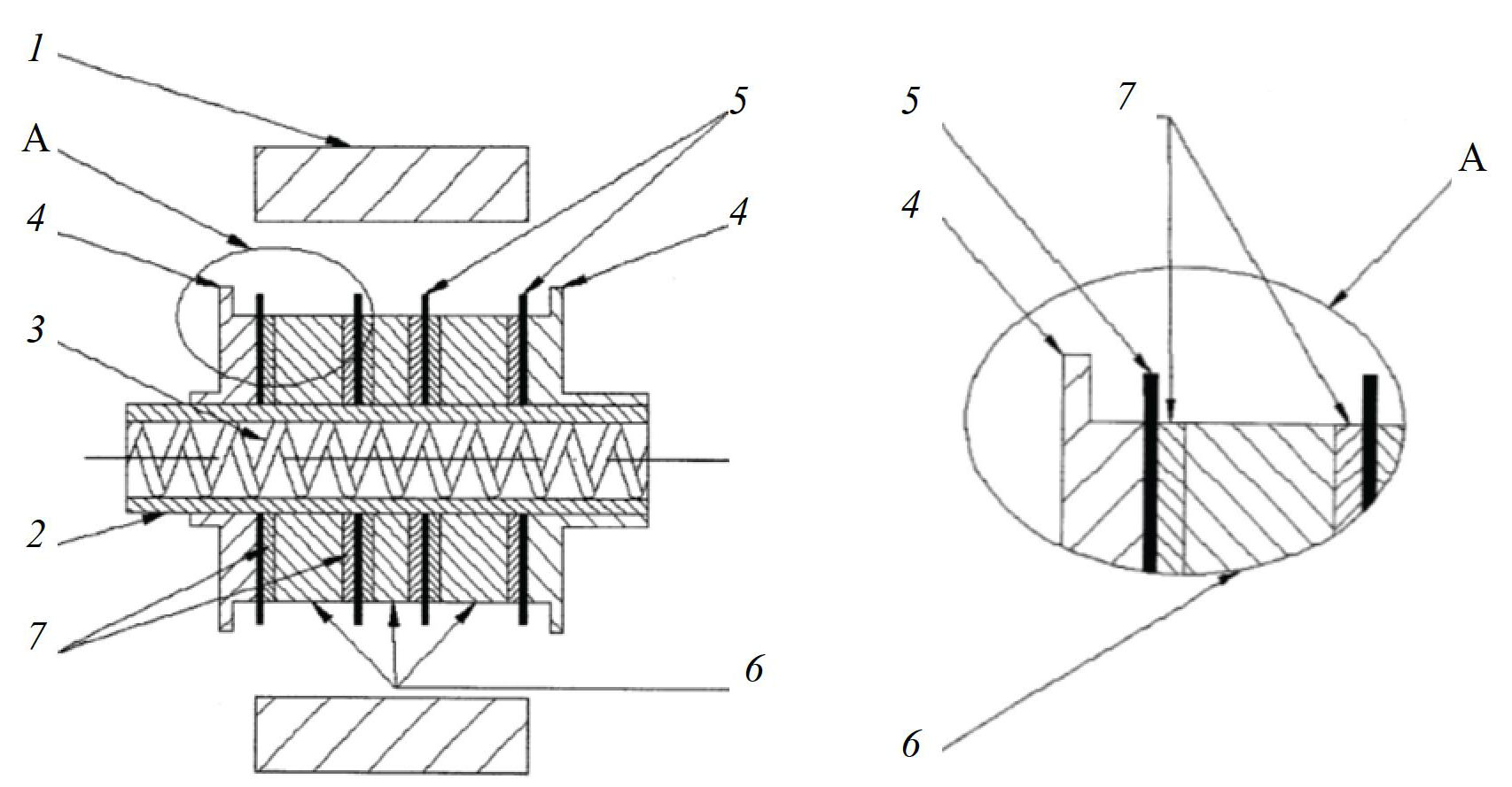 Fig. 3. Schematic representation of the magnetron structure: 1 – anode; 2 – cathode core; 3 – heater; 4 – screens; 5 – autoelectronic cathodes; 6 – secondary emission emitters; 7 – AEC activator washers [78]