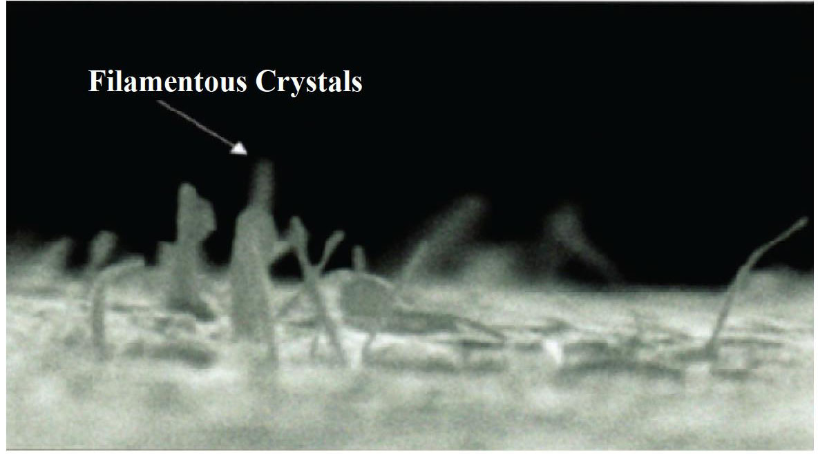 Fig. 4. Micrographs of fragments of the FEC end surface at magnification of M ~ 50000´ (inside the image: filamentous crystals) [78]