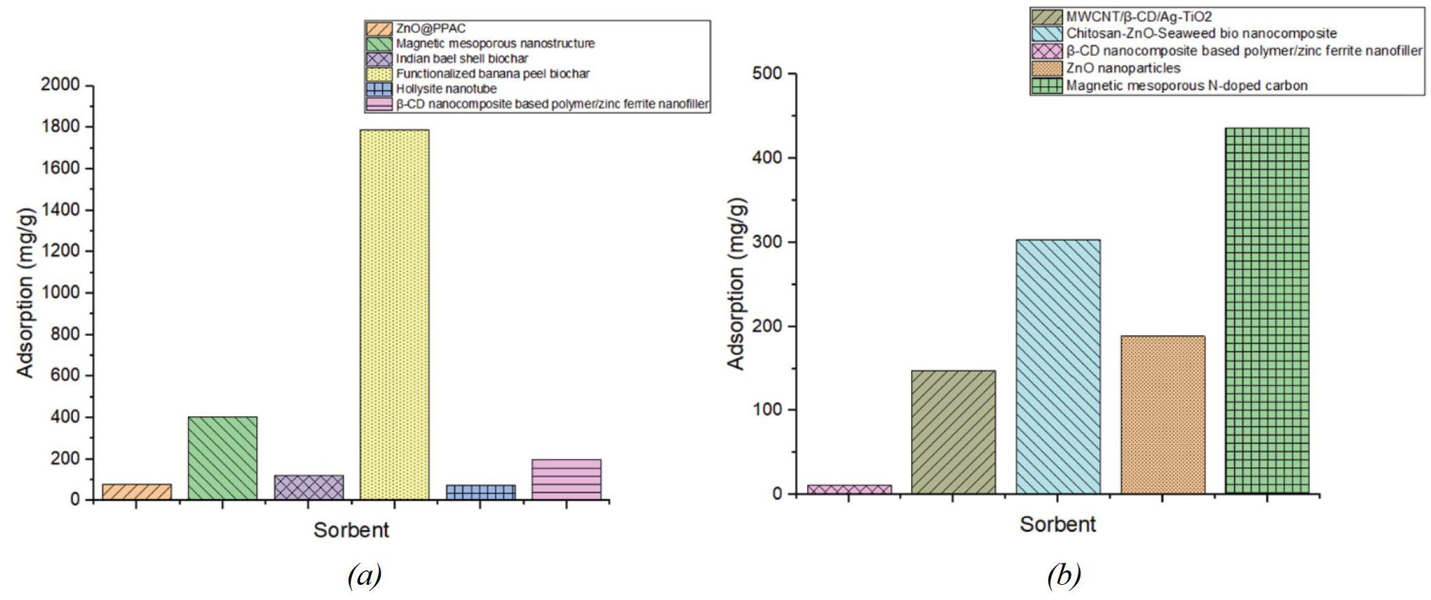 Fig. 1. Literature data on the sorption of MG (a) and CR (b) on different types of sorbents and their sorption capacity