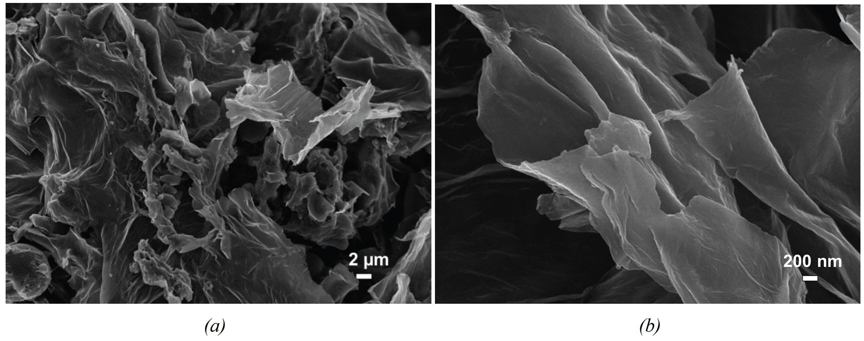 SEM images (Fig. 3) of the nanocomposite sorbent indicate that the material has a rather loose structure. The carbon backbone of the biochar is predominantly covered with graphene sheets. Individual aggregates of micrometer-sized graphene sheets are also found.