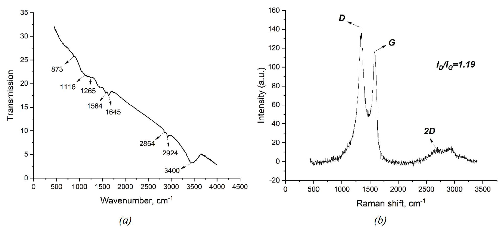 Fig. 4. FTIR (a) and Raman (b) spectra of the nanocomposite from rapeseed plant waste