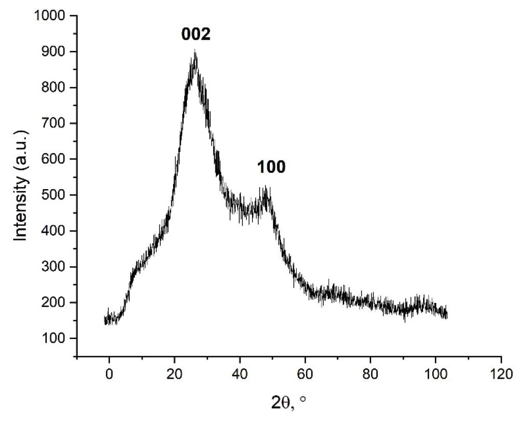Microphotographs were obtained using an AURIGA CrossBeam scanning electron microscope (SEM) with Inca X-Max 80 mm2 EDS (Carl Zeiss Group, Germany). Thermo Scientific ARL Equinox 1000 (TechTrend Science Co., Ltd., Taiwan) (λ = = 0.1540562 nm (copper anode) was used to identify the crystal structure of the material. The orderliness of the carbon framework was evaluated by Raman spectroscopy on a DXR Raman Microscope instrument (Thermo Scientific Instruments Group, Waltham, USA) (λ = 633 nm). IR spectra were obtained on a Jasco FT/IR 6700 FTIR spectrometer (Jasco International Co., Ltd., Japan) in the frustrated total internal reflection mode.