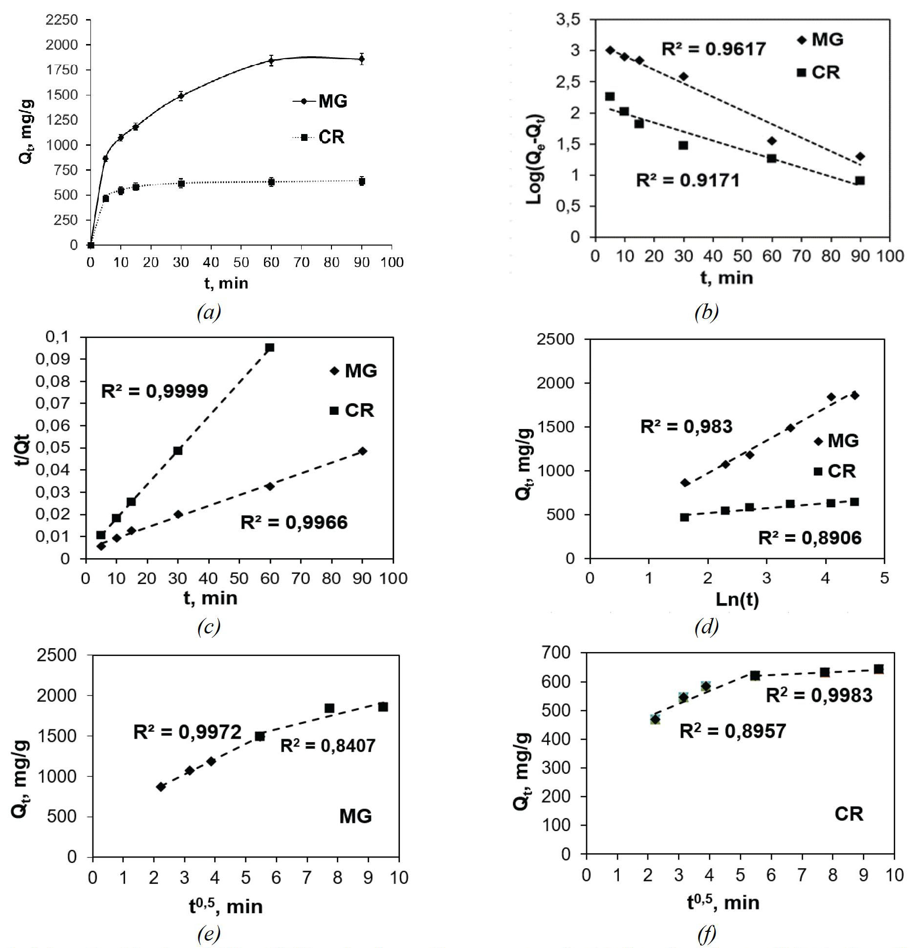 Based on the experimental results, the kinetic dependencies of the adsorption of CR and MG on the developed nanocomposite were plotted (Fig. 6a). The experimental values of the adsorption capacity of the material with respect to MG were 1860 mg·g–1 and 642 mg·g–1 for CR. It should be noted that the equilibrium of the adsorption process for CR adsorption is reached in 15 min. The extraction of MG is slower – saturation of the sorbent is reached in 60 min.