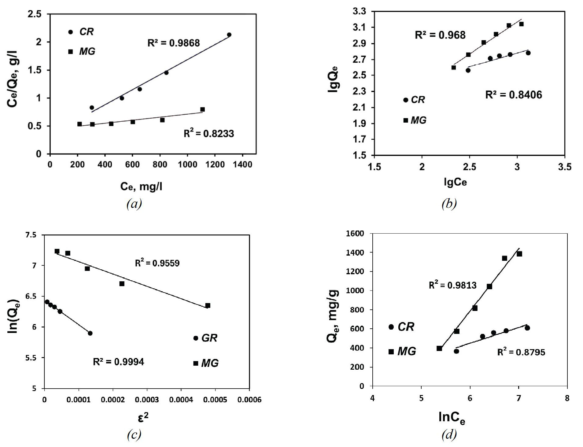 Fig. 8. Models of adsorption isotherms of CR and MG: a – Langmuir; b – Freundlich; c – Dubinin–Radushkevich; d – Temkin