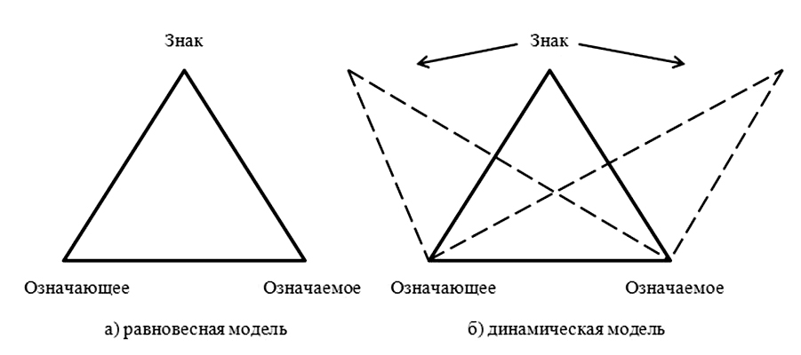 Возникает необходимость теоретической ревизии дидактически безупречной равновесной модели языкового знака, которая предполагает не отказ от модели равнобедренного треугольника, а всего лишь сомнение в ее фактической исполнимости на кортеже фактов, представленных планом содержания (см. рис. 1).