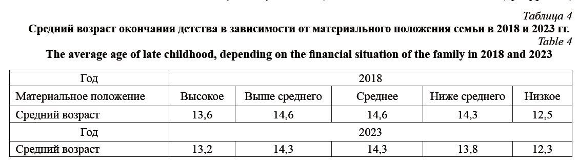13 лет, по сравнению с юношами 2018 г. выше, и в то же время доля юношей в 2023, считающих, что детство еще продолжаетс, ниже, чем в 2018 г., но все равно достаточно высокая, что подтверждает идею парадоксальности одновременно раннего и позднего взросления, прежде всего, применительно к юношам. По всем группам респондентов с ранним, субъективно нормативным и поздним взрослением отмечаем, что повысилась к 2023 году доля тех, кто отметил материальное положение во время их детства как высокое и выше среднего, и понизился процент тех, кто фиксировал свое материальное положение в детстве как низкое и ниже среднего. Немного повысился средний возраст окончания детства тех, кто проживает в больших и небольших городах, но при этом существенно снизился средний возраст окончания детства тех, кто проживает в сельской местности в 2023 году по сравнению с 2018 годом. В 2023 году по всем территориям тех, чье детство подошло к концу в интервале от 10 до 13 лет, выше, чем в 2018 г., в то время как тех, у кого детство не завершилось, ниже.