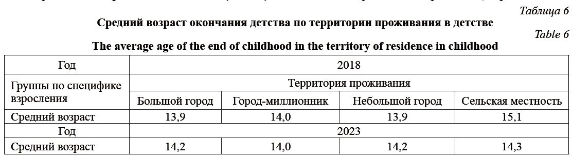Отметим, что существенных различий по среднему возрасту окончания детства в зависимости от пола не обнаружено как в 2018 г., так и в 2023 г.: у мальчиков – 14,4, у девочек – 14,6 в 2018 г. и у мальчиков – 14,1, у девочек – 14,2 в 2023 г.