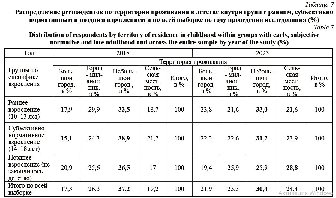 в сельской местности. Так, с одной стороны, наблюдаем снижение среднего возраста окончания детства в сельской местности (табл. 6), но с другой стороны, в группе с поздним взрослением в 2023 году больше тех, кто проживал в сельской местности в детстве (28,8 %) (табл. 7).