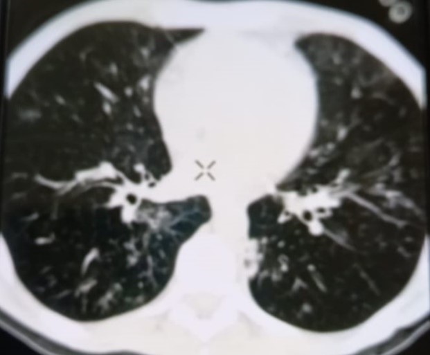 Учитывая на подозрительные в отношении туберкулеза легких КТ-признаки, пациенту впервые проведена метод ПЦР-диагностики выявления ДНК микобактерий туберкулеза, который показал положительный результат, что позволило установить диагноз «Диссеминированный туберкулез легких, двусторонний. КУМ «-» в сочетании с коронавирусной инфекцией COVID-19 средней степени тяжести, пневмоцистной пневмонией и бактериальной пневмонией» у пациента с ВИЧ-инфекцией 4В стадии. Для дальнейшей терапии пациент был переведен в стационар туберкулезного профиля.