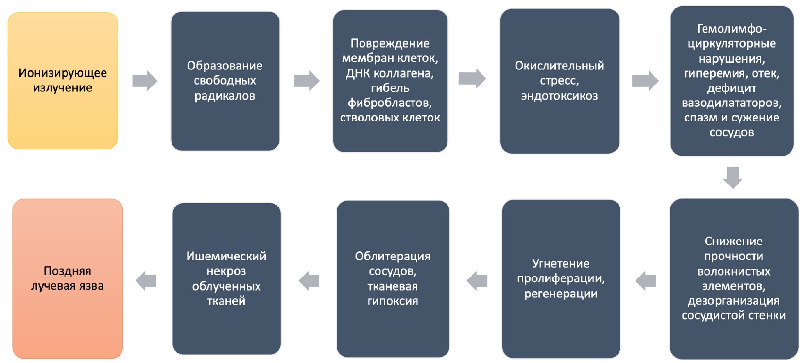 Важная роль в патогенезе лучевых язв кожи отводится нарушению тканевой микроциркуляции c последующим развитием ишемического некроза, как исхода лучевого эпителиита сосудов микроциркуляторного русла. По причине нарушения репарационных процессов и хронического воспаления, заживление язвенной поверхности происходит долгое время. В дальнейшем может присоединиться инфекция, приводящая к усугублению негативных процессов заживления. Также, особенностями лучевой язвы кожи являются длительная экссудация и медленное отторжение некротизированной ткани вследствие недостаточной иммунной реактивности. Далее в процессе заживления лучевой язвы кожи развивается грануляционная ткань, и происходит длительная эпителизация поражения, которая может продолжаться годами (Пасов В.В., 2010). Учитывая вышеперечисленные факты, купирование окислительного стресса тканей стоит рассматривать как приоритетную задачу патогенетической терапии, решение которой возможно применением антиоксидантов.