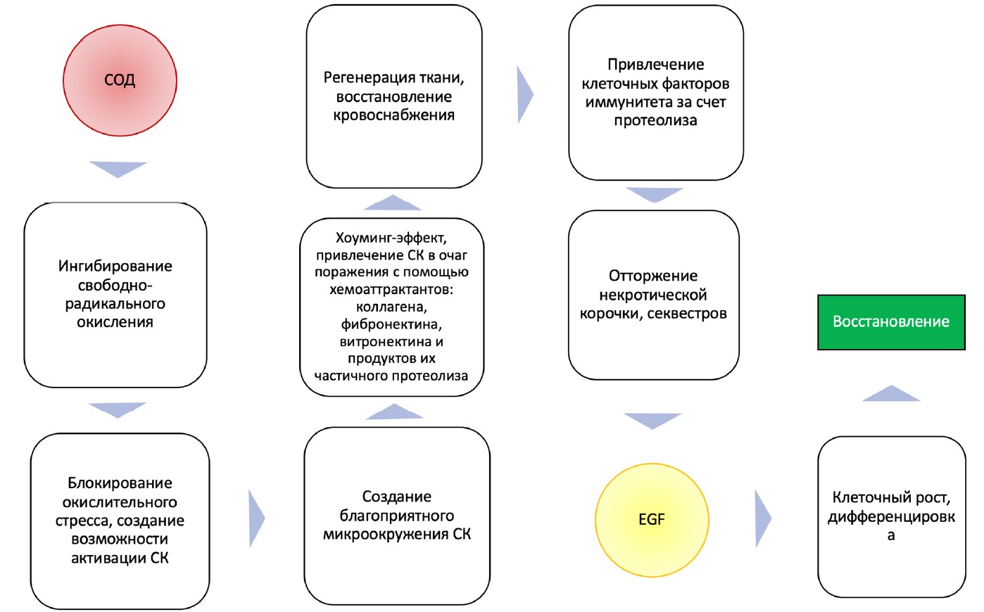 Клиническое применение Cu-, Zn-содержащих форм СОД в настоящее время реализовано в составе таких лекарственных препаратов, как «Рексод» (Егорова Д.А., Чурилова И.В., 2018) [9, 11], «Содерм Форте», «Пероксинорм», «ЭриСОД», что, учитывая патогенез поздних лучевых язв кожи, создает возможность применения ферментных антиоксидантов в их лечении (рис. 2).