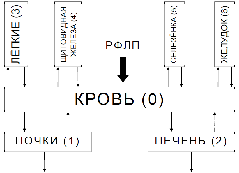 Фармакокинетическое (камерное) моделирование кинетики РФЛП в организме экспериментальных животных позволяет количественно описать течение процесса in vivo, математически рассчитывать скорости перехода РФЛП между органами и тканями (камерами модели), а также зависимые от них фармакокинетические и дозиметрические характеристики [5]. Кроме того, метод камерных моделей и построения экспоненциальных функций камерного накопления–выведения даёт естественную возможность строить индивидуальные модели кинетики РФЛП в критических органах и патологических очагах и тем самым обеспечить более адекватную оценку уровней их внутреннего радиационного облучения, чем применение стандартных методик из рекомендаций Международной комиссии по радиологической защите [6].