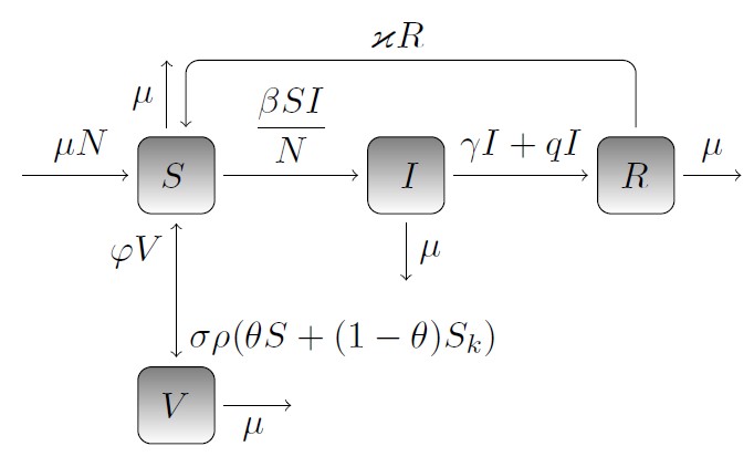 где параметры имеют следующие значения: доля тех, кто вакцинирован обязательно, потому что их работа связана с повышенным риском; доля тех, кто вакцинировался добровольно; эффективность вакцины; скорость затухания иммунитета; эффективная скорость передачи; скорость выздоровления; , где карантин, лечение после карантина; ( ) ограничение поставок вакцины. Переходы между категориями в популяции указаны на рис. 2.