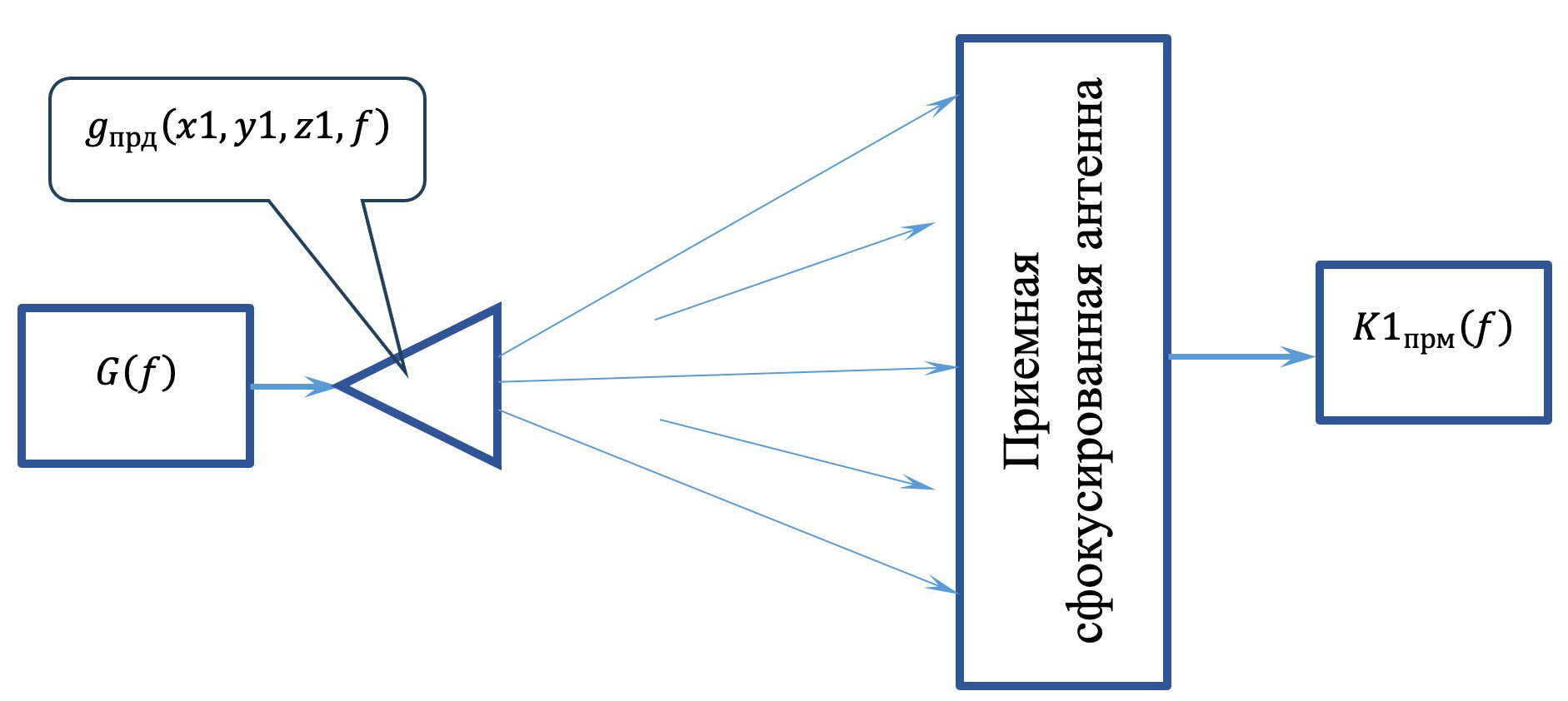 Заметим, что в общем случае может оказаться нецелесообразно разделение на свойства сфокусированных широкополосных антенн в режиме приема и передачи, а можно переходить непосредственно к введению представления радиолинии содержащей передающую и приемную части, характеризуемые параметрами передающей антенны, среды распространения и приемной части, содержащей приемную антенну и тракт обработки, характеризуемые спектром передаваемого сигнала, частотной характеристикой среды и параметрами линейного приемника.